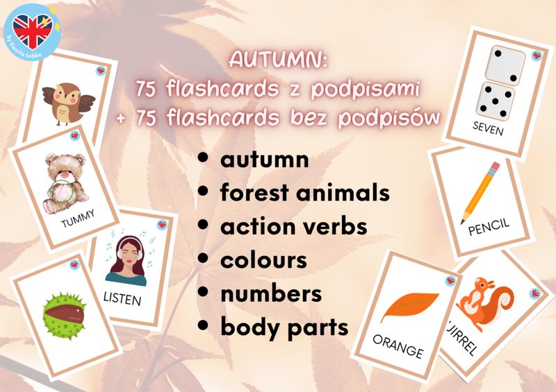 Zestaw obejmuje łącznie 150 kart obrazkowych (75 z podpisami i 75 bez podpisów oraz „plecki" przeznaczone na tył karty) z tematów: autumn forest animals action verbs colours numbers body parts Karty szczególnie polecane są do przedszkola oraz klas 1-3 🙂