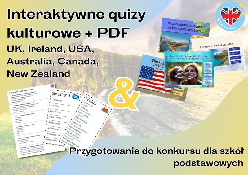 Pakiet quizów kulturowych - interaktywnych oraz do druku - wykorzystasz m.in.: ✅ podczas przygotowań uczniów do KONKURSU KURATORYJNEGO - również jako self-study! ✅ podczas zajęć dodatkowych i kół językowych ✅ na zastępstwach ✅ do tworzenia turniejów i quiz battles ✅ podczas rozgrzewki lub na zakończenie lekcji ✅ na zajęciach online lub stacjonarnych ✅ jako dopełnienie kulturowych projektów edukacyjnych - jak np. projekt Culture Corner! ✨ Pakiet zawiera: • karty do druku z basic facts na temat krajów anglojęzycznych, które najczęściej pojawiają się na konkursach - wersja ucznia oraz klucz dla nauczyciela (Anglia, Szkocja, Walia, Irlandia, Stany Zjednoczone, Australia, Nowa Zelandia, Kanada) • the UK & Ireland: history (quiz interaktywny + pdf) • the UK & Ireland: geography (quiz interaktywny + pdf) • the UK & Ireland: cities & landmarks (quiz interaktywny + pdf) • the UK & Ireland: famous people (quiz interaktywny + pdf) • the USA: history (quiz interaktywny + pdf) • the USA: geography (quiz interaktywny + pdf) • the USA: cities & landmarks (quiz interaktywny + pdf) • the USA: famous people (quiz interaktywny + pdf) • Australia: general information (quiz interaktywny + pdf) • New Zealand: general information (quiz interaktywny + pdf) • Canada: general information (quiz interaktywny + pdf) • the UK & Ireland: general information (quiz interaktywny) • the USA, Australia, Canada: general information (quiz interaktywny) • the UK: traditional dishes (quiz interaktywny) • all countries: important days (quiz interaktywny) • all countries: landmarks (quiz interaktywny) 💥NEW the UK: literature 📚 (quiz interaktywny + pdf) 💥NEW the UK: royal family 👑 (quiz interaktywny + pdf) 💥NEW Ireland: general information ☘️ (quiz interaktywny + pdf) 💥NEW UK & Ireland: music 🎶 (quiz interaktywny + pdf) 💥NEW UK & Ireland: traditions & celebrations 🎉 (quiz interaktywny + pdf) 💥NEW Scotland: general information🥁 (quiz interaktywny + pdf) 💥NEW Wales: general information 🐉 (quiz interaktywny + pdf) 💥NEW Northern Ireland: general information🌉 (quiz interaktywny + pdf) 💥 NEW the USA: literature 📚 (quiz interaktywny + pdf) 💥 NEW the USA: music 🎷 (quiz interaktywny + pdf) 💥 NEW the USA: traditions & celebrations 🎆 (quiz interaktywny + pdf) 💥 NEW the USA: presidents 🇺🇸 (quiz interaktywny + pdf) 💥 NEW the USA: Native American culture 🪶 (quiz interaktywny + pdf) 💥 NEW the USA: states & capitals 🗽 (quiz interaktywny + pdf) 💥 NEW Australia: nature & geography🐨 (quiz interaktywny + pdf) 💥 NEW Australia: history 🏛️ (quiz interaktywny + pdf) 💥 NEW Australia: famous people ⛹🏻‍♂️ (quiz interaktywny + pdf) [Wszystkie quizy oznaczone ikonką NEW są tegoroczną nowością - quizy dotyczące USA i Australii zaktualizują się już niebawem!]