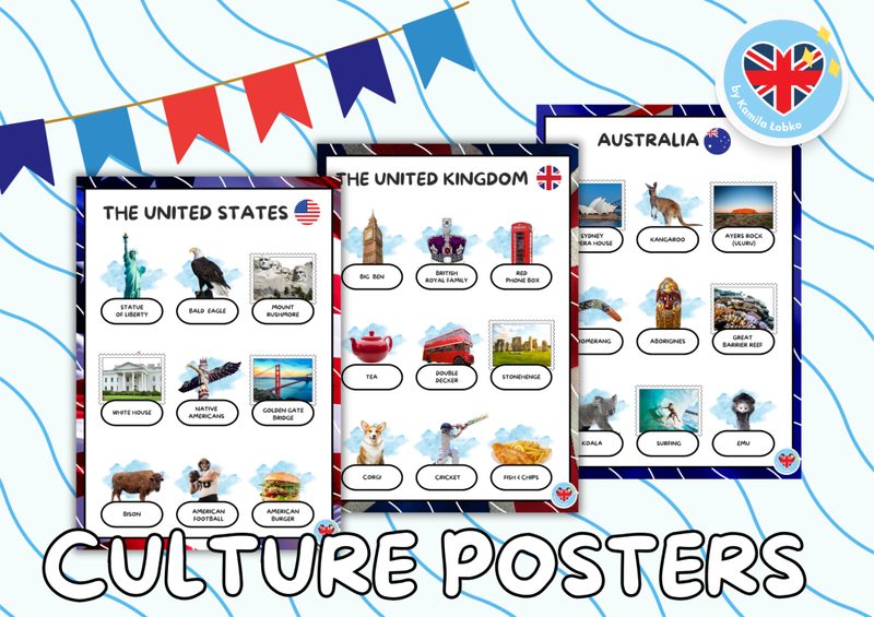 Zestaw plakatów, które udekorują Twoją klasę lub pracownię językową oraz w czytelny sposób przedstawią Twoim uczniom najważniejsze symbole związane z krajami anglojęzycznymi: ich zabytkami, przyrodą, kuchnią czy sportem. Każda plansza zawiera 9 zdjęć wraz z podpisami w języku angielskim. Tematyka plakatów jest uniwersalna, zatem możesz wykorzystywać je przez cały rok szkolny, a dodatkowo jako przypomnienie treści kulturowych np. przed konkursem. Stanowią świetną dekorację i wizualną powtórkę. W zestawie dostępny format A4 i A3. W pakiecie: • The United Kingdom • The United States • Australia