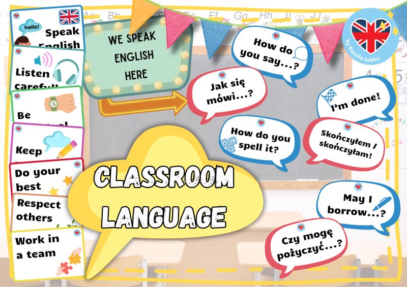 Na dobry początek przyszłego roku szkolnego, startowy must-have każdych zajęć językowych: Classroom Language do dekoracji sali! 👉Ale czy tylko „dekoracji"? Absolutnie nie! 🙂 , bo umieszczone w widocznych miejscach klasy czy pracowni językowej komunikaty będą nie tylko ✅utrwalały ważne zwroty, ✅ porządkowały ustalone na początku roku zasady, ale także ✅bezpośrednio aktywizowały uczniów w konkretnych sytuacjach na każdych zajęciach! • 12 ilustrowanych kart Classroom Rules & Motivational Messages + szablony do wpisania własnych zasad i haseł, sformułowanych z naszymi uczniami • 14 kart Questions (najczęściej zadawanych przez uczniów pytań po angielsku i po polsku) w postaci dymków + szablony do wpisania własnych pytań (takich, które powracają jak bumerang na każdej lekcji 😉 ) • znak We speak English here do umieszczenia np. na drzwiach pracowni językowej