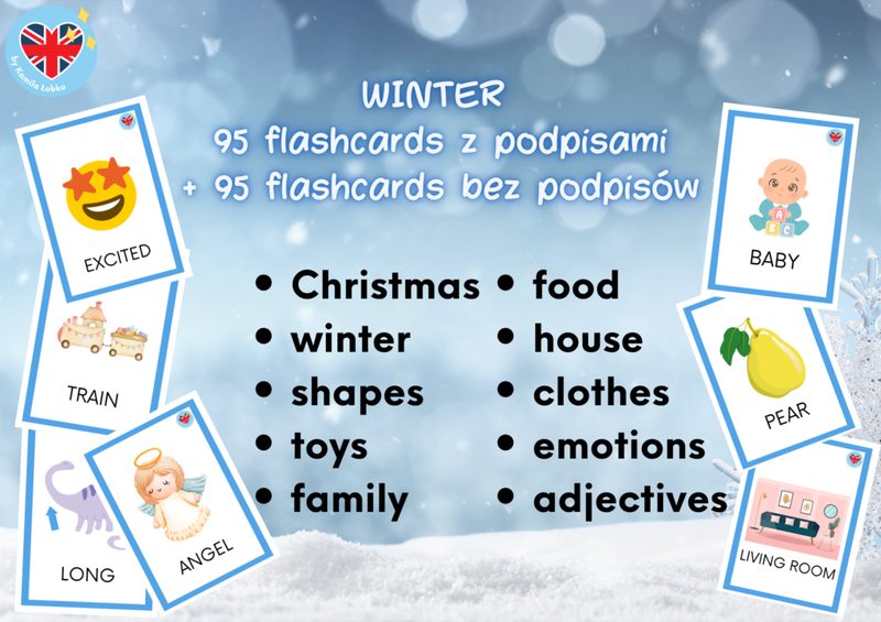 Zestaw obejmuje łącznie 190 kart obrazkowych (95 z podpisami i 95 bez podpisów oraz „plecki" przeznaczone na tył karty) z tematów: Christmas winter shapes toys family food house clothes emotions basic adjectives Karty szczególnie polecane są do przedszkola oraz klas 1-3 🙂