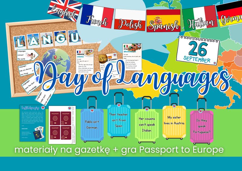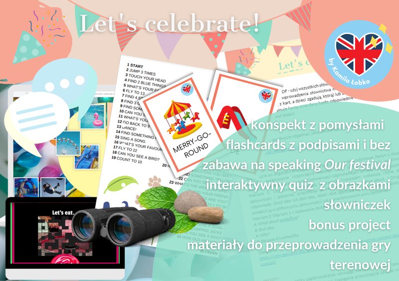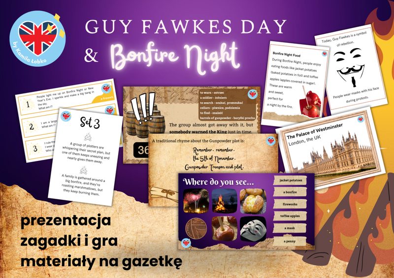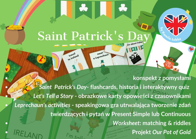 Pakiet Culture Corner obejmuje następujące zestawy: 1. Wales: St David's Day 2. Ireland: St Patrick's Day 3. England: St George's Day 4. Scotland: St Andrew's Day Każdy z nich zawiera: • MATERIAŁY NA GAZETKĘ Napis i basic facts o kraju, flaga, drogowskaz prowadzący do najsłynniejszych zakątków każdego z krajów wraz ze zdjęciami, sekcje (odpowiednio dla danego kraju): Symbols, Fun Facts (Ciekawostki), Traditional Dishes z podpisami, kody QR kierujące do nagrań codziennych zwrotów po irlandzku i walijsku, Famous People, a także dużo barwnych, pasujących i ŁATWYCH DO WYCIĘCIA ilustracji oraz miejsce na wypowiedzi uczniów • Interaktywną PREZENTACJĘ do przeprowadzenia w klasie w formie aktywizujących ucznia warsztatów - na każdym kroku pełną aktywności, w które zaangażujesz uczniów w formie turnieju • GRĘ PODŁOGOWĄ do przeprowadzenia w klasie np. w formie warsztatów 🙂 ➡ Uczniowie poruszają się po klasie, ćwicząc gramatykę w kontekście kultury danego kraju na dwóch poziomach trudności! ➡ Uczniowie współpracują w drużynach i utrwalają gramatykę jednocześnie! W każdym z zestawów ćwiczymy inny zakres gramatyki: Wales: Level 1: przedimek nieokreślony 'a'/'an', czasownik 'to be', czasownik 'have got', konstrukcja 'there…', czas Present Simple. Level 2: some/any/no, stopniowanie przymiotników, czasy Present Continuous, Past Simple, Present Perfect, Past Continuous, few/a few/little/a little Ireland: Level 1: zaimki wskazujące this/that/these/those, przymiotniki dzierżawcze my/your/his/her/our/their, czasowniki „have” i „be”, czas Present Simple, przyimki czasu in/on/at, dopełniacz saksoński (’s). Level 2: Present Perfect, already/yet, for/since, zaimki dzierżawcze (mine/yours…), często mylone przymiotniki i zaimki (his vs him, our vs us, their vs them), must & have to] England: Level 1: przedimek określony „the" vs przedimek nieokreślony „a", czas Present Simple (twierdzenia, pytania, przeczenia), czasownik „can" Level 2: czas Future Simple, konstrukcja „be going to", okresy warunkowe: 0 & 1st conditional, time prepositions: przyimki czasu (at/on/in), reflexive pronouns: zaimki zwrotne (myself, yourself itd.) vs object pronouns, possessive adjectives Scotland: Level 1: czas Present Continuous (twierdzenia, pytania, przeczenia), konstrukcja “Let’s…”, pytania szczegółowe (Wh- questions) Level 2: zdania względne (relative clauses: which, who, whose…), często mylone pytania z operatorem DO vs inwersją TO BE, zaimki nieokreślone z some-, any-, no-, every- (indefinite pronouns: something, somebody, somewhere…)
