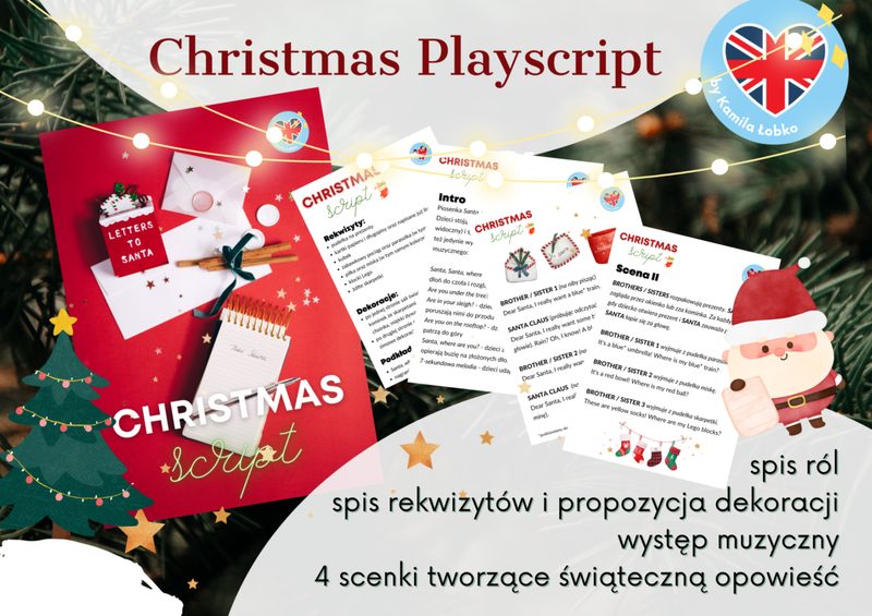 Dlaczego warto przygotowywać z uczniami przedstawienia w języku angielskim? Tego rodzaju inscenizacje: 🔵 ćwiczą pamięć 🔵 uczą współpracy 🔵 pomagają w przyswajaniu słownictwa i struktur gramatycznych - zwłaszcza, jeżeli tekst przedstawienia uwzględnia rytm, pewną powtarzalność 🔵 angażują emocje w naukę języka 🔵 pomagają w aktywizacji języka - użycie w kontekście, często wspomagane odpowiednią gestykulacją, ruchem Pakiet zawiera: 1️⃣ ENGLISH ZOO Przedstawienie o nauce języka angielskiego, które można zorganizować w dowolnym momencie roku szkolnego z uczniami zerówki lub klas 1-3? Czemu nie! Wybierzmy się do zoo - ale nie byle jakiego… 😉 🐆🐘🦒🐒🦘🐅🦏🐫 English Zoo to przedstawienie, w którym przeróżne zwierzaki pomogą dzieciom w nauce angielskiego - dobra zabawa gwarantowana! Możecie urządzić je z okazji dnia języka angielskiego w Waszej placówce, Dnia Języków Obcych, dnia otwartego, rozpoczęcia czy zakończenia roku szkolnego… - wpasuje się w naprawdę każdą okazję! ☺️ Zestaw zawiera: ✅ SPIS RÓL (dla 8-10 osób + nieograniczonej liczby osób biorących udział w części muzycznej) ✅ SPIS REKWIZYTÓW I DEKORACJI ✅ SCENARIUSZ (4 scenki) ✅ WYSTĘP Z PIOSENKĄ (treść piosenki z układem choreograficznym oraz nagraniem w mp3) ✅ DEKORACJE DO DRUKU (duży szyld zoo, plakietki z nazwami zwierząt) 2️⃣ CHRISTMAS PLAYSCRIPT Christmas Playscript to kompletny scenariusz przedstawienia o nieco roztargnionym Świętym Mikołaju, składający się ze spisu ról (na trzech poziomach trudności), spisu rekwizytów, propozycji dekoracji sceny, występu muzycznego oraz czterech scenek świątecznej opowieści ❤️ Przedstawienie możesz oczywiście dowolnie dostosować do możliwości swoich uczniów ☺️ Zestaw zawiera: ✅ SPIS RÓL: na 3 poziomach trudności, dzięki czemu zaangażujesz wszystkich uczniów: zarówno małą, jak i większą grupkę! ✅ Dokładny SPIS REKWIZYTÓW: łatwo dostępne rzeczy, które pomogą dzieciom zrozumieć treść i ubarwią występ ✅ szczegółowy SCENARIUSZ: przedstawienie składa się z 4 scenek oraz występu muzycznego 3️⃣ GRANDPARENTS DAY Jeżeli szukacie wzruszającego, a jednocześnie łatwego do przygotowania przedstawienia z okazji Dnia Babci i Dziadka dla Waszych przedszkolaków lub uczniów klas 1-3, z pomocą przychodzi Grandparents' Day Playscript 💞🧑🏼‍🦳👨🏼‍🦳 Zestaw zawiera: ✅ krótki wstęp muzyczny (piosenka wykorzystuje dobrze znaną dzieciom melodię, dzięki czemu nie będzie trudna do opanowania, zaś naukę prostego tekstu wspomoże dokładnie opisana gestykulacja 😊) ✅ SPIS RÓL na różnych poziomach trudności (10-11 ról + nieograniczona liczba dzieci występujących z piosenką) ✅ Dokładny SPIS REKWIZYTÓW wraz z propozycją DEKORACJI sali: łatwo dostępne rzeczy, które pomogą dzieciom zrozumieć treść i ubarwią występ ✅ szczegółowy SCENARIUSZ: przedstawienie składa się z 2 scenek oraz występu muzycznego 4️⃣ SUMMER PLAYSCRIPT Jeżeli chodzi Wam po głowie zorganizowanie z uczniami występu z okazji zakończenia roku szkolnego (lub też innego przedstawienia odbywającego się w okresie wiosenno-letnim), łapcie przepis na przedstawienie, którego główne tematy to: ⚽️ sport ⛺️ wypoczynek na świeżym powietrzu ✈️ podróże …a więc tematy, które na pewno pojawiły lub pojawią się na zajęciach z Waszymi uczniami 💚 PS. Rozpoczęcie przygotowań wcześniej pozwoli dzieciom na płynne opanowanie przebiegu występu i treści ról, a przy tym idealnie wpasuje się w tematykę zwyczajowo omawianą w tym okresie roku! 🙂 Zestaw zawiera: ✅ SPIS RÓL: na 3 poziomach trudności, dzięki czemu zaangażujesz wszystkich uczniów: zarówno małą, jak i większą grupkę! ✅ Dokładny SPIS REKWIZYTÓW: łatwo dostępne rzeczy, które pomogą dzieciom zrozumieć treść i ubarwią występ ✅ szczegółowy SCENARIUSZ: przedstawienie składa się z 4 scenek oraz występu muzycznego