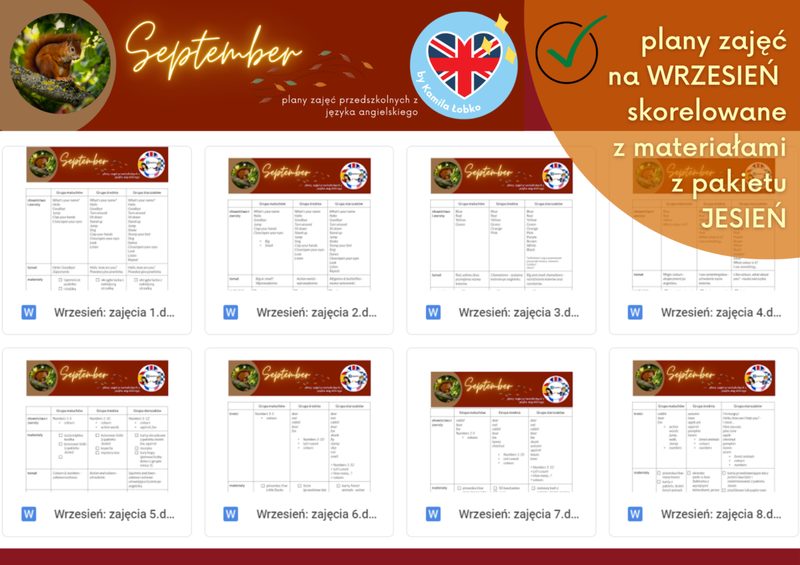 Mega Pack Angielski w przedszkolu: Four Seasons to połączenie dwóch całorocznych, skorelowanych ze sobą pakietów: pakietu scenariuszy zajęć oraz pakietu materiałów pdf. Zawiera także szczegółowy rozkład materiału na każdy miesiąc. 1) Pakiet wszystkich scenariuszy zajęć (od września do czerwca) Scenariusze zajęć na każdy miesiąc obejmują następujące obszary tematyczne: Wrzesień: action verbs, numbers, colours Październik: school supplies, autumn, forest animals Listopad: body parts, Teddy Bear Day, Hedgehog Day Grudzień: toys, Christmas, winter Styczeń: family, house, food Luty: emotions, clothes (Carnival), Dinosaur Day Marzec: pets, the weather, Easter Kwiecień: spring, farm animals, Earth Day Maj: zoo animals, Mother’s Day, sports Czerwiec: summer & holiday places, Oceans Day, Father’s Day 2) Pakiet materiałów pdf na wszystkie pory roku Co znajdę w pakiecie? obszary tematyczne omawiane podczas każdej z czterech pór roku oraz lekcje tematyczne związane ze specjalnymi dniami i nietypowymi świętami przypadającymi w danym okresie – łącznie ponad 400 stron PDF!