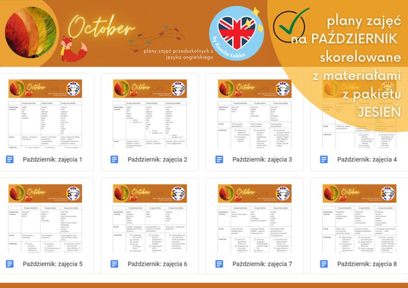 Zestaw 20 gotowych scenariuszy zajęć wraz z materiałami PDF na cały październik dla dzieci w wieku żłobkowym. Zawiera piosenki, zabawy sensoryczne i ruchowe oraz materiały do druku.