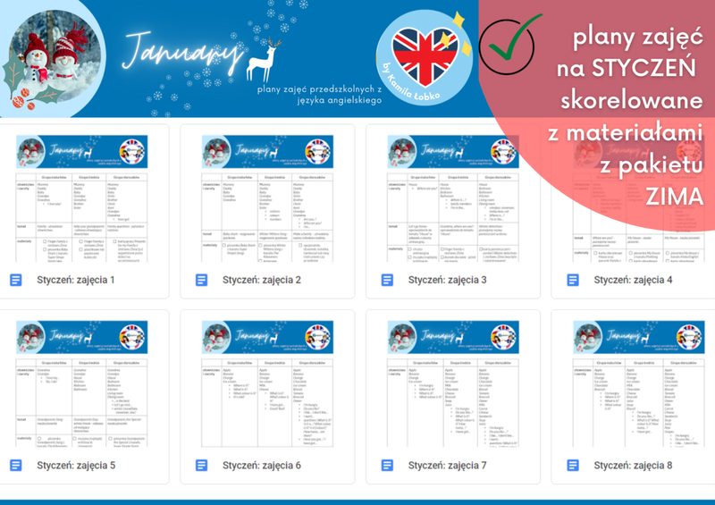 Zestaw 20 gotowych scenariuszy zajęć wraz z materiałami PDF na cały styczeń dla dzieci w wieku żłobkowym. Zawiera piosenki, zabawy sensoryczne i ruchowe oraz materiały do druku.