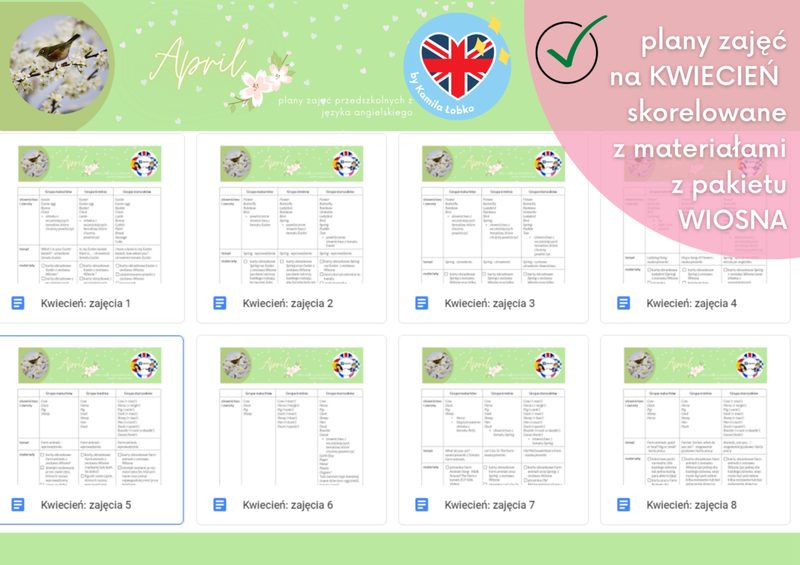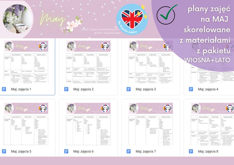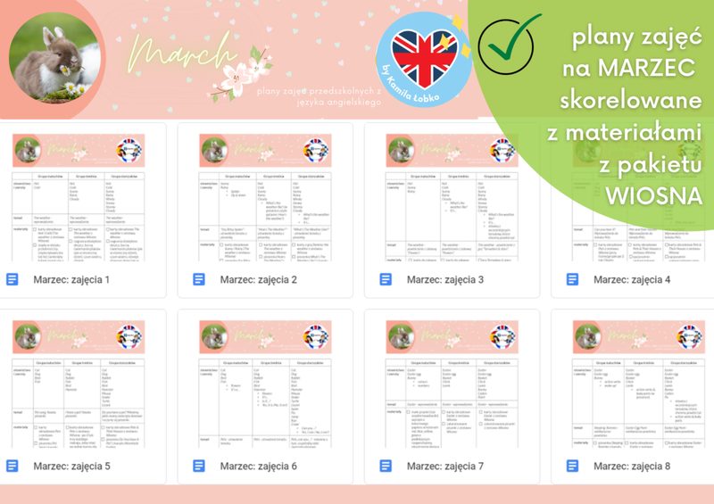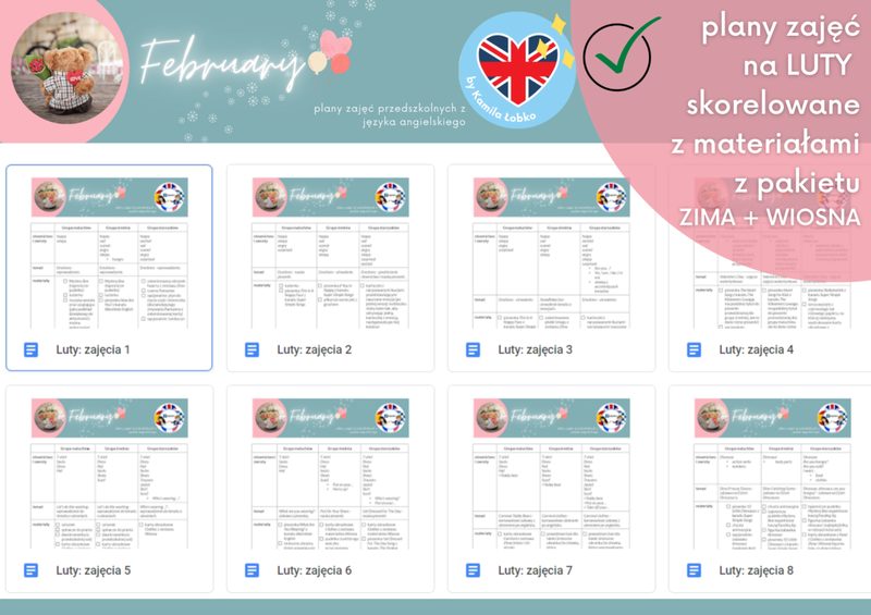 PAKIET SCENARIUSZY ZAJĘĆ na 5 miesięcy Scenariusze zajęć obejmują następujące obszary tematyczne: Luty: emotions, clothes (Carnival), Dinosaur Day Marzec: pets, the weather, Easter Kwiecień: spring, farm animals, Earth Day Maj: zoo animals, Mother’s Day, sports Czerwiec: summer & holiday places, Oceans Day, Father’s Day Każdy ze scenariuszy jest opracowany dla trzech grup wiekowych: maluchów (3 lata), średniaków (4 lata) i starszaków (5-6 lat). W każdym miesiącu jest ich , więc sprawdzą się idealnie, jeżeli angielski jest prowadzony w każdej z grup 2 razy w tygodniu. Scenariusze są w pełni skorelowane z MATERIAŁAMI z pakietu 4 pór roku… (jeśli jeszcze nie słyszałaś o pakiecie materiałów na 4 pory roku – kliknij tutaj) Co zawierają scenariusze zajęć? słownictwo i zwroty do wprowadzenia na poszczególnych zajęciach; temat zajęć do wpisania do dziennika (zgodnie z zaleceniem większości placówek sformułowany częściowo po angielsku, częściowo po polsku); spis potrzebnych materiałów w postaci wygodnej listy do odznaczania – szablony, gry, karty obrazkowe czy karty pracy do druku dostępne w zestawie materiałów “4 pory roku“ przebieg każdych zajęć ze szczegółowo opisanymi krokami SCENARIUSZE zajęć są idealnym rozwiązaniem dla Ciebie, jeśli… jesteś zaangażowaną nauczycielką i chciałabyś mieć więcej energii podczas zajęć, nie musząc spędzać godzin na ich wcześniejszym przygotowaniu; chcesz zyskać dodatkowy czas, otrzymując gotowy rozkład materiału i tematy do wpisania do dziennika – by nie martwić się kwestią dokumentacji; lubisz mieć wszystko uporządkowane w jednym miejscu; chciałabyś odkryć jeszcze więcej sposobów na wprowadzanie i utrwalanie słownictwa