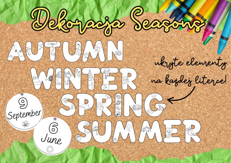 Dekoracja 4 Seasons doskonale ozdobi Waszą salę lekcyjną na każdą z czterech pór roku! 🙂 Zestaw zawiera literki do stworzenia nazw pór roku oraz do każdej z nich pola z nazwami miesięcy i symbolami - łącznie niemal 120 stron PDF! • Kilka wariantów - wydrukuj pełne plansze z barwnym tłem za literkami bez konieczności wycinania lub też same literki na kolorowym papierze albo do pokolorowania przez uczniów - wybór należy do Ciebie! • Elastyczność - możesz uzupełnić dekorację dowolną treścią, umieszczając napis w górnej części tablicy raz, na początku danej pory roku, a w międzyczasie delikatnie modyfikując to, co znajdzie się pod spodem - w zależności od występujących w danym okresie roku dni specjalnych, świąt itp. (które oczywiście również znajdziesz w naszym sklepie!) • Użyteczność - porozmawiaj z uczniami o tym, jaki symbole danej pory roku ukryły się w literkach, ułóżcie o nich zdania po angielsku, wymyślcie dodatkowe słowa związane z daną porą roku rozpoczynające się od tych literek, przeliterujcie nazwy pór roku, zakryj jedno z pól z nazwą miesiąca i poproś uczniów o zapisanie jego nazwy… Używaj zestawu, jak tylko chcesz! 🙂