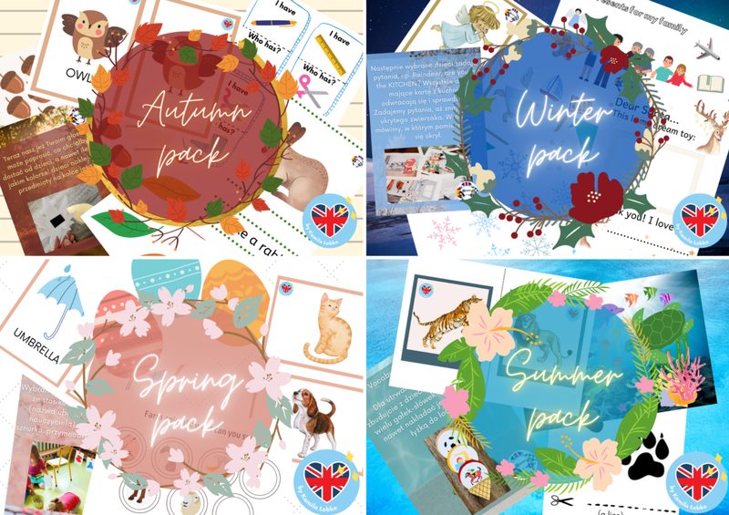 Materiały dydaktyczne podzielone na cztery pory roku: wiosna, lato, jesień, zima. Flashcards, gry, karty pracy.