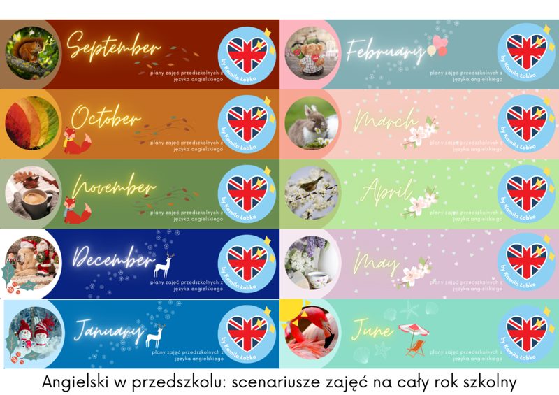 PAKIET SCENARIUSZY ZAJĘĆ na cały rok szkolny Scenariusze zajęć na każdy miesiąc obejmują następujące obszary tematyczne: Wrzesień: action verbs, numbers, colours Październik: school supplies, autumn, forest animals Listopad: body parts, Teddy Bear Day, Hedgehog Day Grudzień: toys, Christmas, winter Styczeń: family, house, food Luty: emotions, clothes (Carnival), Dinosaur Day Marzec: pets, the weather, Easter Kwiecień: spring, farm animals, Earth Day Maj: zoo animals, Mother’s Day, sports Czerwiec: summer & holiday places, Oceans Day, Father’s Day Każdy ze scenariuszy jest opracowany dla trzech grup wiekowych: maluchów (3 lata), średniaków (4 lata) i starszaków (5-6 lat).